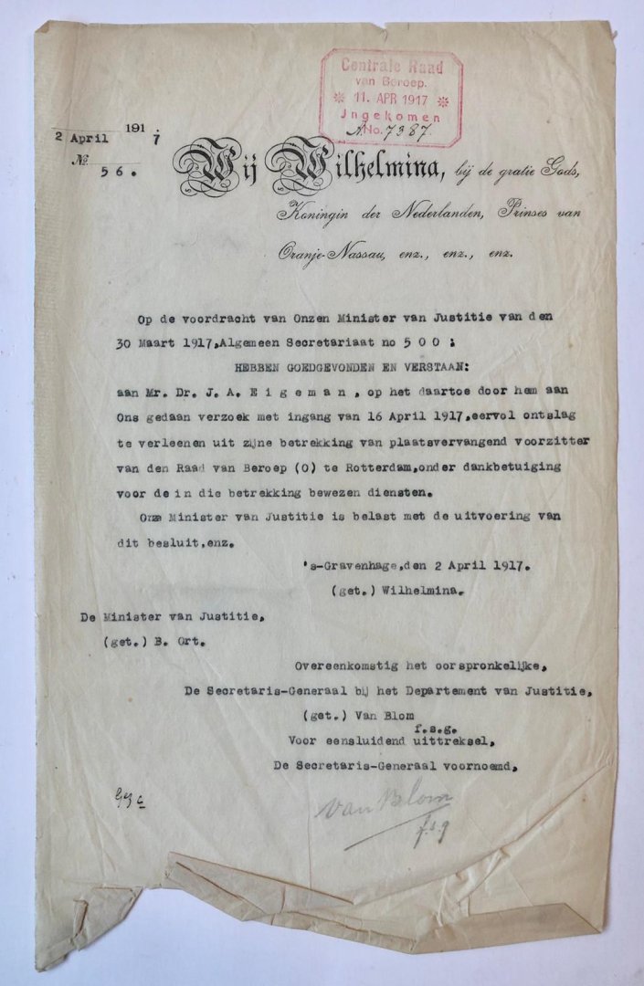 | Titel: | [typed letter 1917] Ontslag voor mr. dr. J.A. Eigeman als plv. voorzitter Raad van Beroep te Rotterdam, typoscript, 1917, 1 p. |