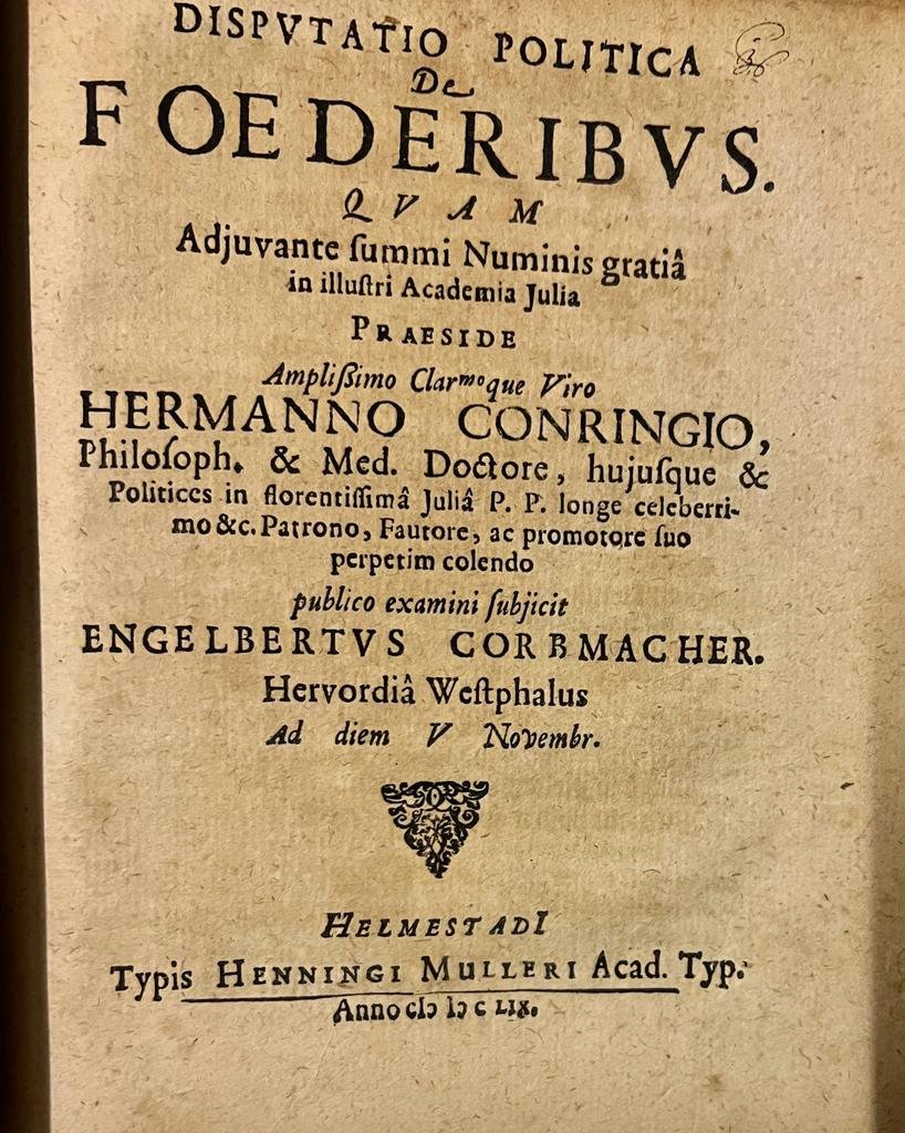 | Titel: | Dissertation 1659 I Disputatio politica de foederibus [...] Helmstedt Henning Müller 1659. |