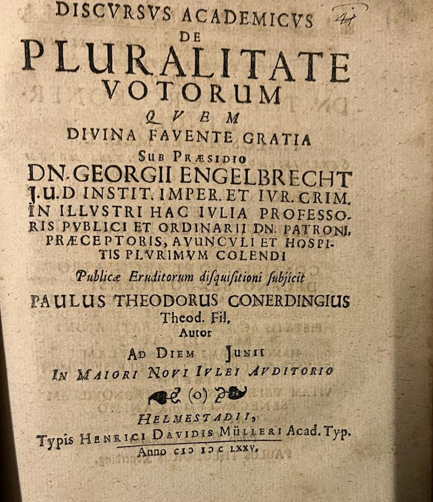 | Titel: | Dissertation 1675 I Discursus academicus de pluralitate votorum [...] Helmstedt Heinrich David Müller 1675. |