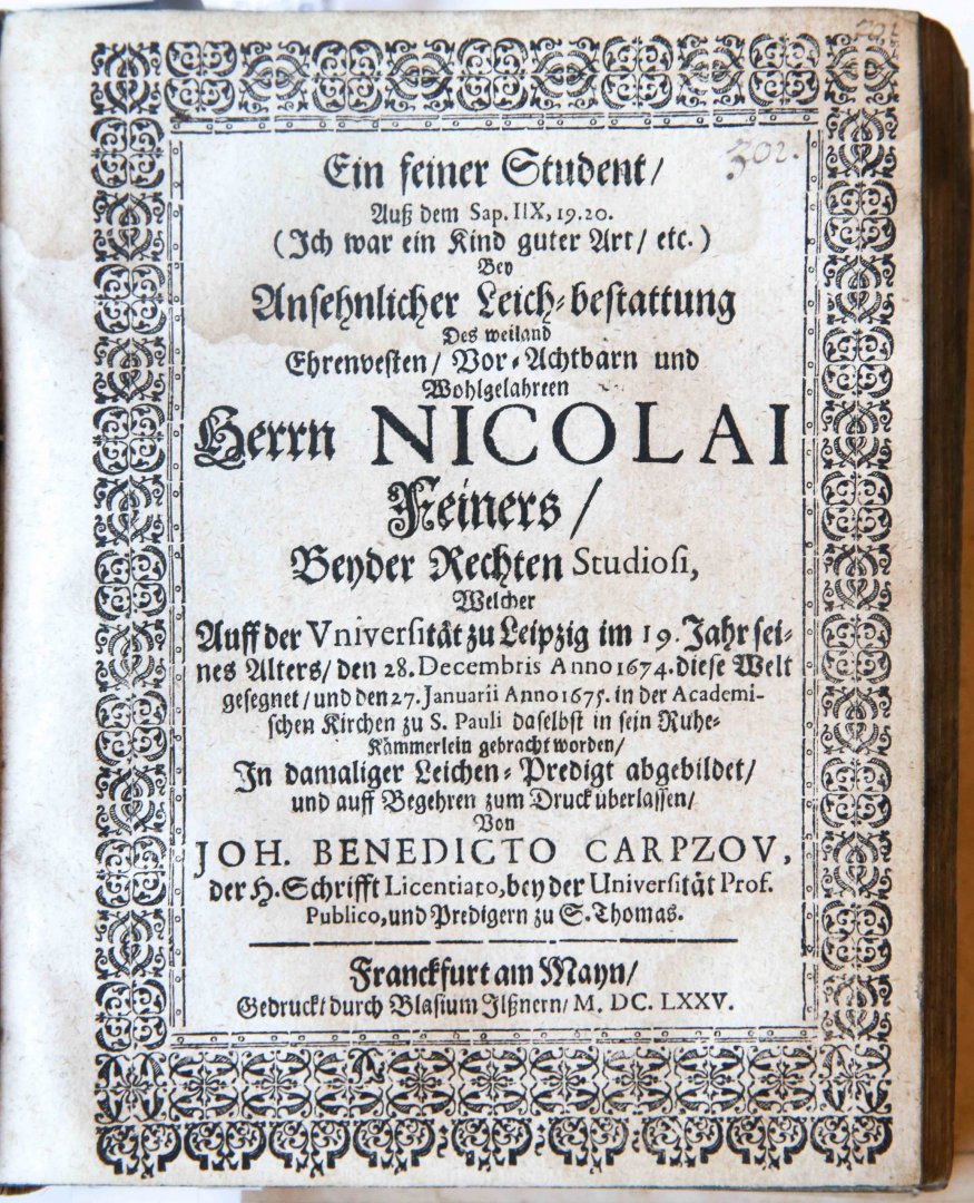 ![Carpzov, Johann Benedict - Ein feiner Student, Auß dem Sap. IIX, 19,20 (Ich war ein Kind guter Art, etc.) Bey ansehnlicher Leich-bestattung des weiland [...] Nicolai Feiners, Beyder rechten Studiosi [...]. Frankfurt Blasius Ilssner 1675 Carpzov, Johann Benedict - Ein feiner Student, Auß dem Sap. IIX, 19,20 (Ich war ein Kind guter Art, etc.) Bey ansehnlicher Leich-bestattung des weiland [...] Nicolai Feiners, Beyder rechten Studiosi [...]. Frankfurt Blasius Ilssner 1675](https://images.boekwinkeltjes.nl/medium/GaRNtikD11Y11HhiJ7Wh.jpg)