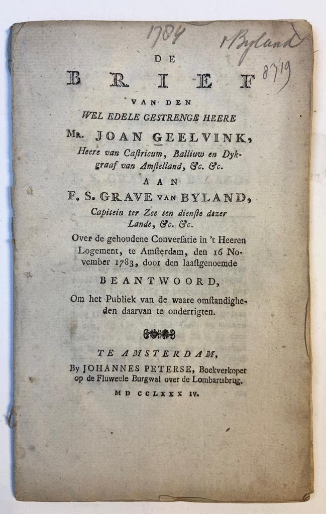 | Titel: | De brief van (...) mr. Joan Geelvink (...) aan F.S. Grave van Byland (...) over de gehoudene conversatie in 't Heeren Logement te Amsterdam, den 16-11-1783, door den laatsgenoemde beantwoord. Amsterdam, J. Peterse, 1784. |