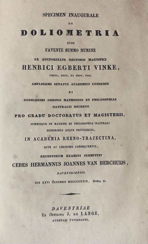 | Titel: | Specimen inaugurale de doliometria [...] Deventer J. de Lange 1839 |