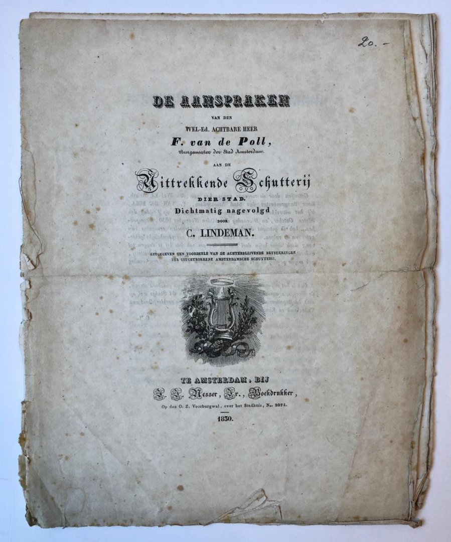 ![AMSTERDAM, SCHUTTERIJ 1830, VAN DE POLL, LINDEMAN - [Printed publication, poetry, 1830] “De aanspraken van (...) F. van de Poll, burgemeester der stad Amsterdam, aan de uittrekkende schutterijen dier stad, dichtmatig nagevolgd door C. Lindeman”, Amsterdam, J.J. Nesser Jr 1830, gedrukt, 4°, 12 p. AMSTERDAM, SCHUTTERIJ 1830, VAN DE POLL, LINDEMAN - [Printed publication, poetry, 1830] “De aanspraken van (...) F. van de Poll, burgemeester der stad Amsterdam, aan de uittrekkende schutterijen dier stad, dichtmatig nagevolgd door C. Lindeman”, Amsterdam, J.J. Nesser Jr 1830, gedrukt, 4°, 12 p.](https://images.boekwinkeltjes.nl/medium/lf7b9SnM2BuJdvOkFoTt.jpeg)