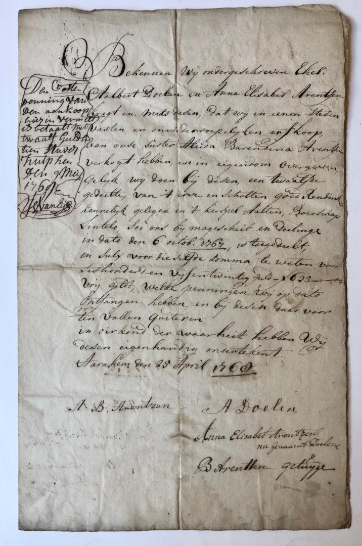 | Titel: | [Legal manuscript 1768] Onderhandse verklaring d.d. Aalten 25-4-1768 van Aalbert Doelen en Anna Elisabet Arentsen (nu genaamt Doelen), dat zij 1/12 van 't erve en scholtengoed Rensink, onder Aalten in Lintelo, verkocht hebben voor ƒ 625,- aan ... |