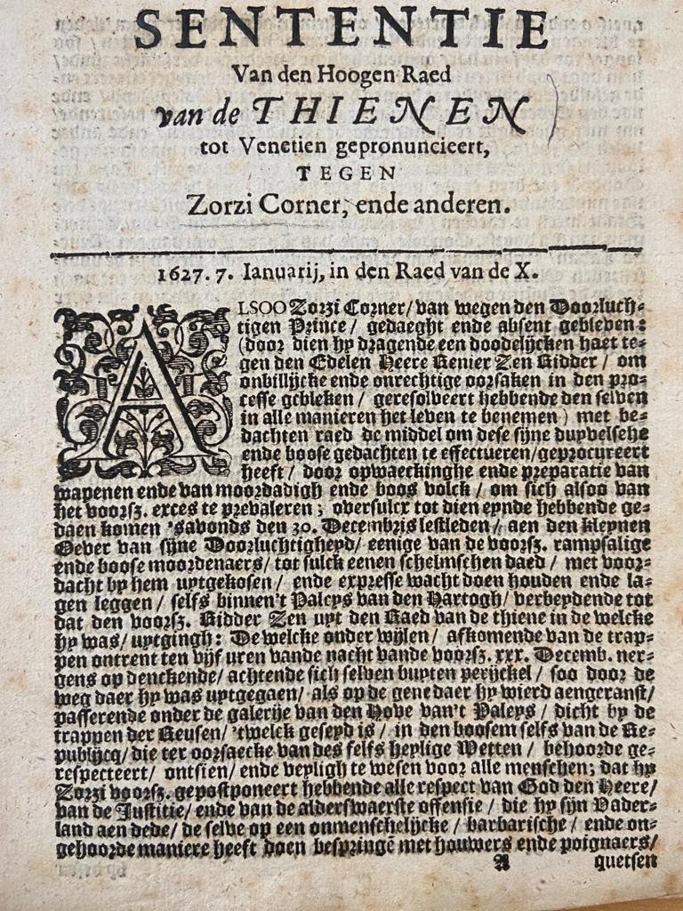 | Titel: | [Venice, Venetië, Pamphlet] Sententie van den Hoogen Raad van de thienen tot Venetien, gepronuncieert tegen Zorzi Corner ende anderen. |
