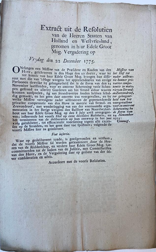 ![- [Original publication 1775] Extract uit de Resolutien van (...) Staaten van Holland (...) 22-12-1775. 's-Gravenhage, [1775]/ On beach combing on Scheveningen strand, The Hague, The Netherlands. - [Original publication 1775] Extract uit de Resolutien van (...) Staaten van Holland (...) 22-12-1775. 's-Gravenhage, [1775]/ On beach combing on Scheveningen strand, The Hague, The Netherlands.](https://images.boekwinkeltjes.nl/medium/gYyTPce0aRbXbh6cY7dx.jpeg)