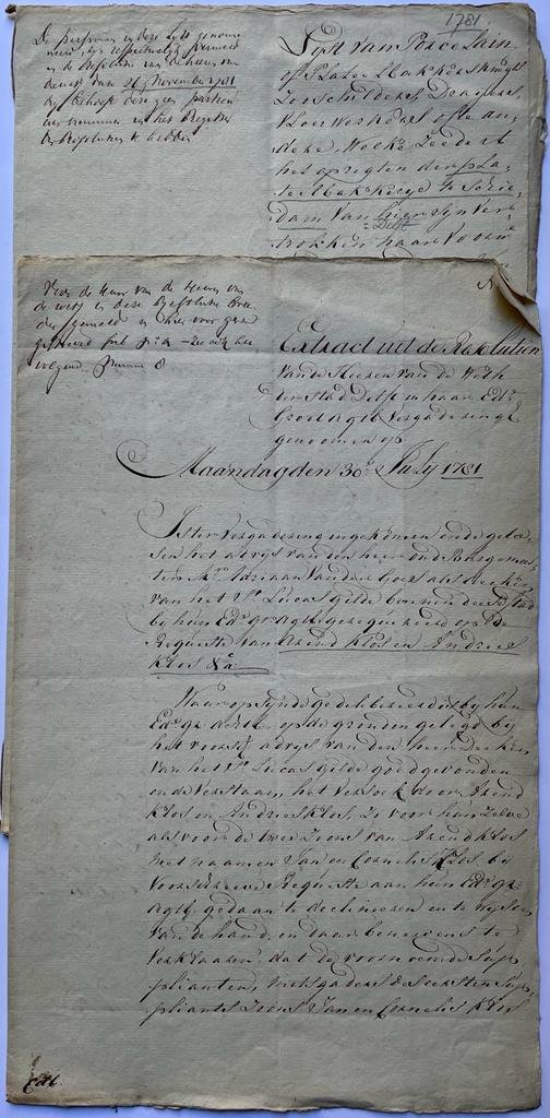| Titel: | Manuscript 1781 | Drie stukken in manuscript betr. het plan van Arend Klos (met zoons Jan en Cornelis) en Andries Klos, om zich tegen de bepalingen in als Delftse plateelbakkers te Schiedam te vestigen. 1781, folio, 9 pp. |