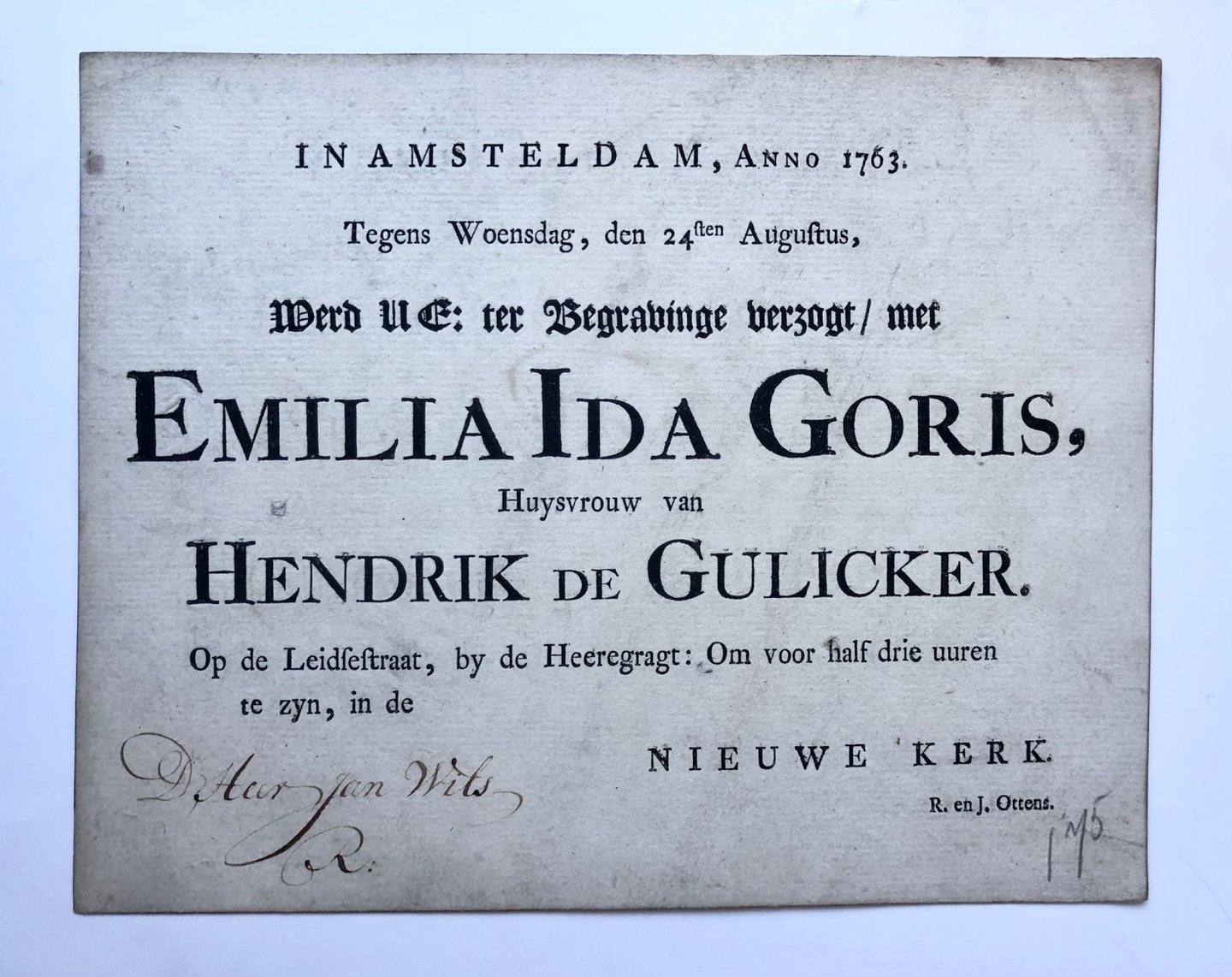 | Meer info: | Uitnodiging voor de begrafenis van Emilia Ida Goris, huisvrouw van Hendrik de Gulicker, Amsterdam 24-8-1763. 4° oblong, 1 pag., gedrukt. |