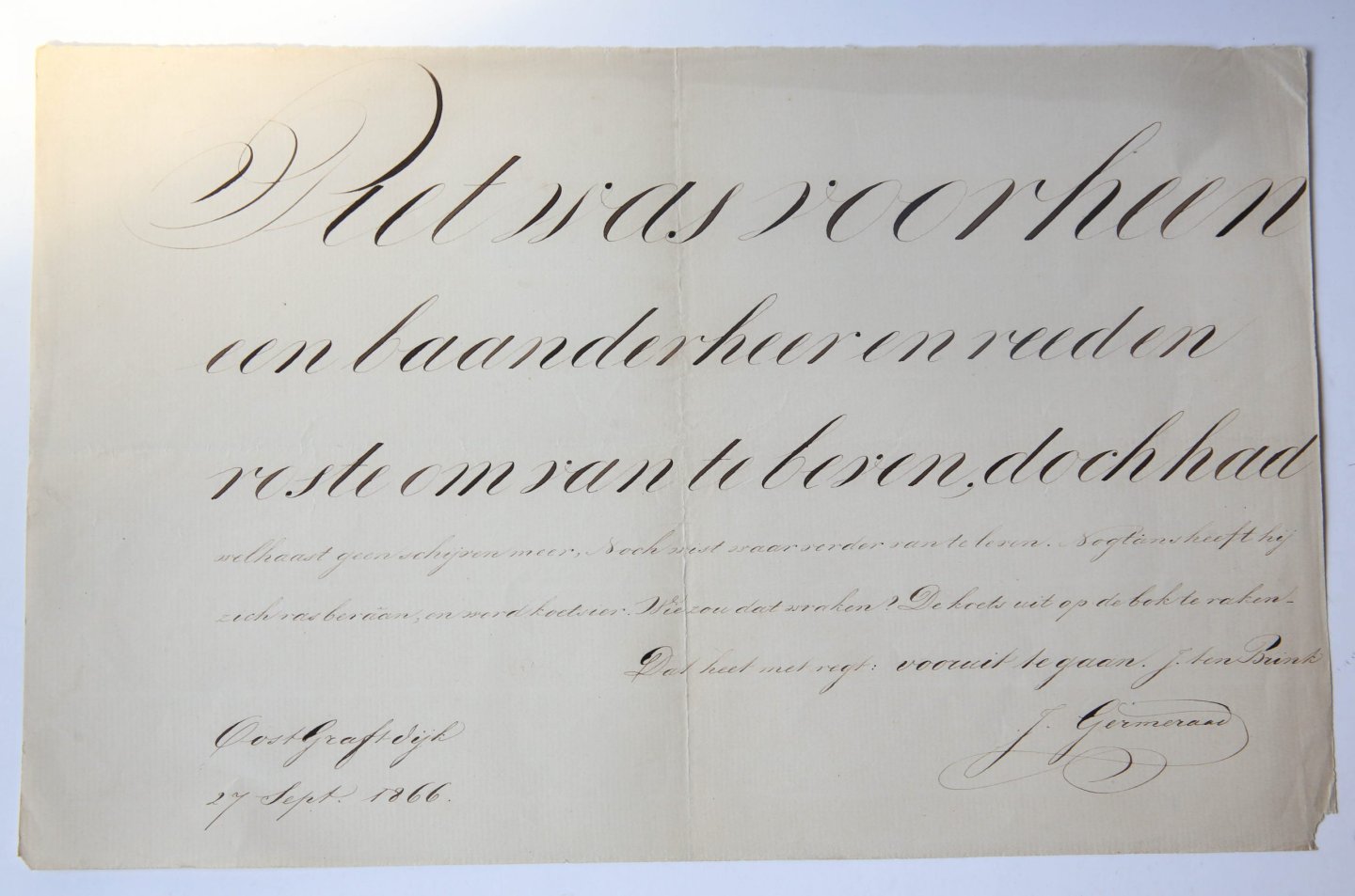 | Titel: | KALLIGRAFIE, ONDERWIJZERS IN NOORD-HOLLAND Bladen kalligrafie, ieder ca. 25x35 cm., beschreven en gesigneerd door een aantal onderwijzers in Noord-Holland boven het Y in de jaren 1827-1872. |