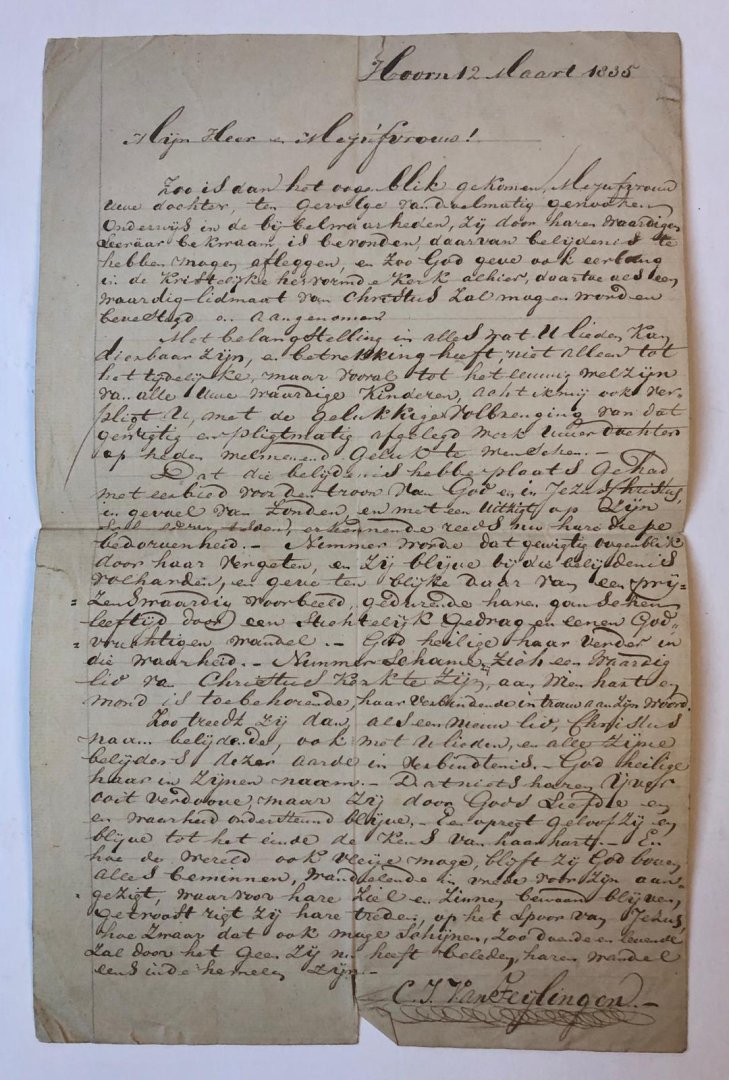 | Titel: | [MANUSCRIPT TEYLINGEN, VAN; HOORN] Brief van C.J. van Teylingen, Hoorn 12 maart 1835, met felicitaties aan de ouders van een meisje dat belijdenis deed. Folio, 1 p. |