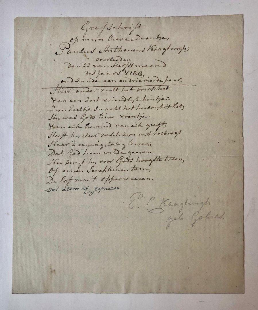 | Titel: | [Manuscript, epitaph, KRAGTINGH] Grafschrift op mijn lieve zoontje Paulus Anthonius Kragtingh, overleeden den 22 van herfstmaand 1788 oud zijnde een en drie vierde jaar. 4o, [1] p. |