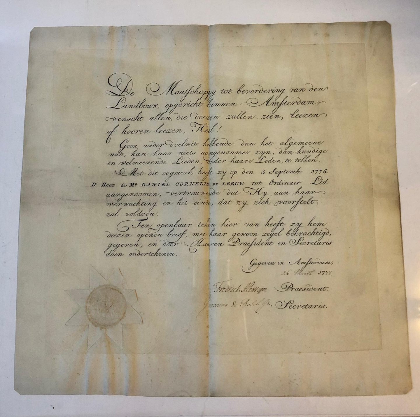 | Titel: | LEEUW, DE; MAATSCHAPPIJ VAN LANDBOUW Lidmaatschapsbul voor Mr. Daniel Cornelis de Leeuw als lid van de Maatschappij tot bevordering van den Landbouw, opgericht binnen Amsterdam. Amsterdam 26 maart 1777, getekend door Fredrick Alewijn, pres., e... |