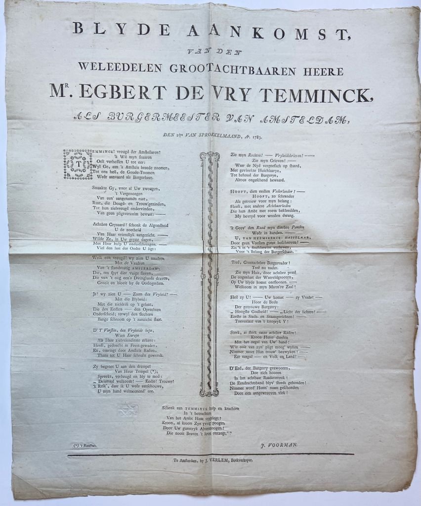 ![- [Printed publication 1783] Blyde aankomst van ... Mr. Egbert De vry temminck als burgermeester van Amsteldam, den 2den van sprokkelmaand Ao 1783. Amsterdam, J. Verlem. Plano. - [Printed publication 1783] Blyde aankomst van ... Mr. Egbert De vry temminck als burgermeester van Amsteldam, den 2den van sprokkelmaand Ao 1783. Amsterdam, J. Verlem. Plano.](https://images.boekwinkeltjes.nl/medium/sKzG5dcP9uwsSrommwWP.jpeg)
