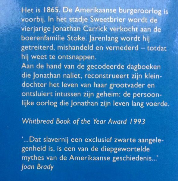 (De Geus) ISBN 90-5226-279-9 uitgave uit 1995 350 pp pocket Staat van het boek: 7.5 Begin 1994 werd deze roman van de 54-jarige Amerikaanse auteur bekroond met de Whitbread Book of the Year Award. Dit merkwaardige verhaal van een slavenleven is geïnspireerd door het leven van haar grootvader. Die werd toen hij vier was verkocht aan een tabaksboer in een periode toen er tekort aan arbeidskrachten was na de bevrijding van zwarte slaven. De blanke slaaf gaat er op zijn 16de vandoor, wordt wagonrangeerder en uiteindelijk predikant. Zijn leven staat in het teken van haat. Het verhaal wordt verteld door de kleindochter van de hoofdfiguur die met de hulp van de getuigenissen van haar oom en de gecodeerde dagboeken van haar grootvader diens levensverhaal probeert te reconstrueren. De roman dankt zijn kracht aan de sterke evocatie van de bijzonder intense emoties. Merkwaardig zijn de citaten van oorlogsfilosoof Von Clausewitz die het motief van de oorlog voortdurend naar voren duwen en een parallellie tussen persoonlijke en mundiale conflicten suggereren. Een bijzonder originele roman, geschreven in een subtiele literaire vertelstijl en vakkundig opgebouwd. Prijs €3,50 |