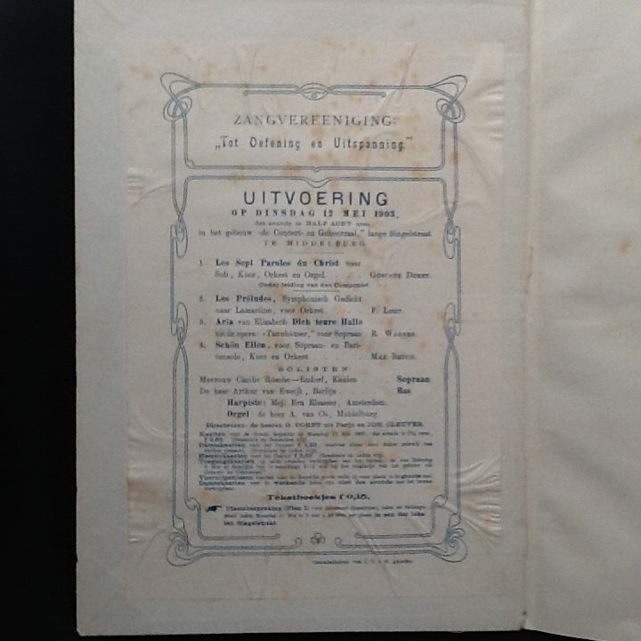 | Meer info: | Partituur : Duits : Klavierauszug met duitse en engelse tekst. Ingeplakt een programma van Middelburgse zangvereniging uit 1903. Ook een met o.inkt geschreven naam en de datum 17 mei 1884 |