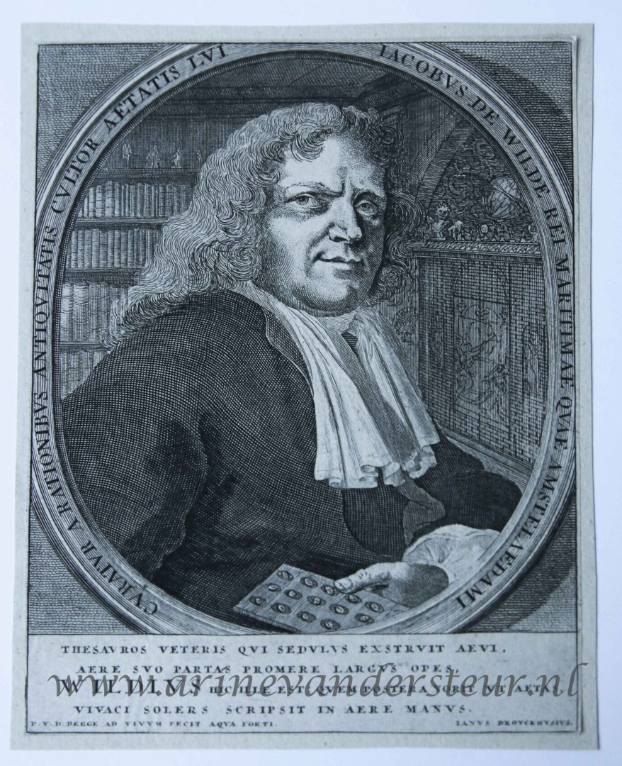 | Bijzonderheden: | Portrait of the collector Jacob de Wilde (1645-1721) in his studio. Lettered in the oval frame:'CURATUR A RATIONIBUS ANTIQUITATIS CULTOR AETATIS LVI IACOBUS DE WILDE REI MARITIMAE QUAE AMSTELAEDAMI '; lettered below:'Thesauros Veteris... IANUS BRO... |