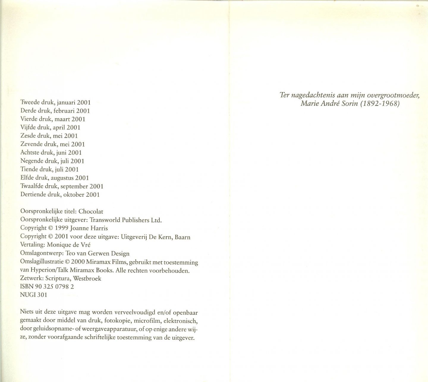 | Schrijver: | Harris, Joanne .. Monique de Vre fotografie Omslag Judith Dekker |