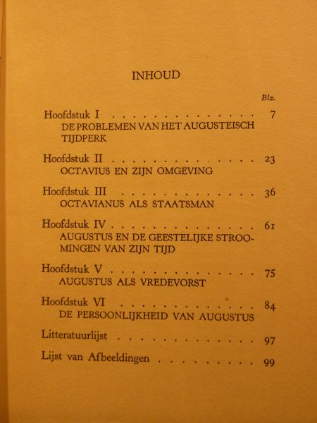 Bruine vlekken aan de binnenkant van de kaft zowel voor als achter. Zie foto's. Hoofdstuk I: De problemen van het Augusteisch tijdperk, II: Octavius en zijn omgeving, III: Octavianus als staatsman, IV: Augustus en de geestelijke stromingen van zijn tijd, V. Augustus als vredevorst, VI: De persoonlijkheid van Augustus, Litteratuurlijst, Lijst van Afbeeldingen.