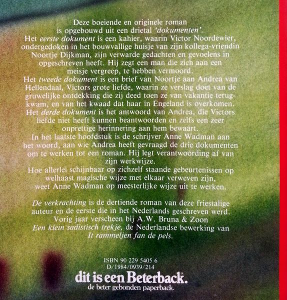 (A.W. Bruna & Zoon - Utrecht / Aartselaar) ISBN 90 229 5405 6 uitgave uit 1984 128 pp softcover gebonden ***NIEUWSTAAT*** Staat van het boek: 10.0 De 39-jarige leraar Victor Noordewier denkt in een vlaag van verstandsverbijstering een verkrachter te hebben omgebracht. Zich schuilhoudend in het huisje van zijn collega Noortje, gaat hij na hoe hij hiertoe is gekomen, door in een cahier een verslag van zijn misdaad en wat daarna gebeurde, te geven. Het tweede deel van de roman bevat het commentaar op dit verslag van resp. Noortje en Andrea, Victors grote liefde, waardoor niet alleen duidelijk wordt hoe Victor stierf, maar ook wat voor figuur hij werkelijk was. De truc met het zogenaamd "gevonden" manuscript wordt consequent gehandhaafd, aangezien de auteur aan het slot verantwoording aflegt omtrent de vorm en de inhoud. Deze onderhoudende, ingenieus geconstrueerde roman sluit goed aan bij vorig werk van deze Friese auteur: een analyse van een individu in een crisissituatie. Vooral door de verteltechnische kwaliteiten zal het boek vele "ervaren" lezers van literatuur zeker boeien. Deze 3e roman is de eerste die Wadman in het Nederlands schreef. Enkele friestalige werken van hem verschenen in Nederlandse vertaling. Prijs €3,50 |