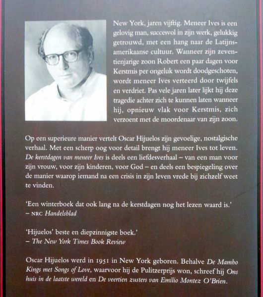 (Anthos - Amsterdam) ISBN 90-414-0110-5 uitgave uit 1996 263 pp paperback ***NIEUWSTAAT*** Staat van het boek: 10.0 Meneer Ives wordt als kind door zijn stiefvader liefdevol opgevoed. Hij blijkt een groot tekentalent te hebben en vindt een baan bij een reclameburo. Als hij met Annie, zijn eerste grote liefde, trouwt lijkt zijn geluk volmaakt. Op zijn werk wordt hij gewaardeerd en hij heeft veel vrienden, vooral van Latijnsamerikaanse afkomst. Zijn zoon Robert overweegt priester te worden, maar hij wordt op 17-jarige leeftijd vermoord. Ives weet geen raad met zijn verdriet en hij en Annie groeien snel uit elkaar. Pas op 70-jarige leeftijd, als hij zich met de moordenaar van zijn zoon verzoent, kan Ives het leven weer aan. De schrijver hangt zijn verhaal op aan een aantal Kerstvieringen in het leven van de hoofdpersoon. Meneer Ives is dol op Kerst en het is dan ook uiterst wrang dat zijn zoon vlak voor Kerst vermoord wordt. Hijuelos, winnaar van de Pullitzer prijs voor een eerdere roman, heeft een prachtig verhaal geschreven waarin Ives' gedachten over leven en dood een prominente rol spelen. De lezer krijgt tevens een interessant tijdsbeeld voorgeschoteld van New York in de jaren vijftig. Prijs €4,50 |