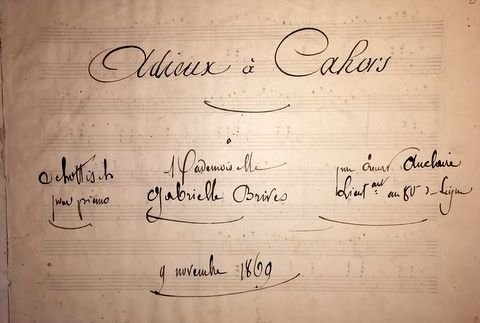 | Titel: | Adieux à Cahors / Schottisch pour piano / Mademoiselle Gabrielle Brives / [unleserlich] Auclaire Lieut.nt. au 80 de Lyon / 9 novembre 1869 |