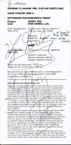 | Titel: | [Programmanzeige mit eigenh. Unterschriften] Concertgebouw Amsterdam. Zaterdag 23 januari 1988. Grote zaal. Vijfde concert |