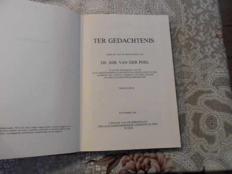 | Meer info: | verslag van de begrafenis van ds. Joh. van der Poel in leven predikant van de oud gereformeerde gemeente (in Nederland) te Ede, alsmede een achttal preken van deze leraar en enkele herinneringsbijdragen |