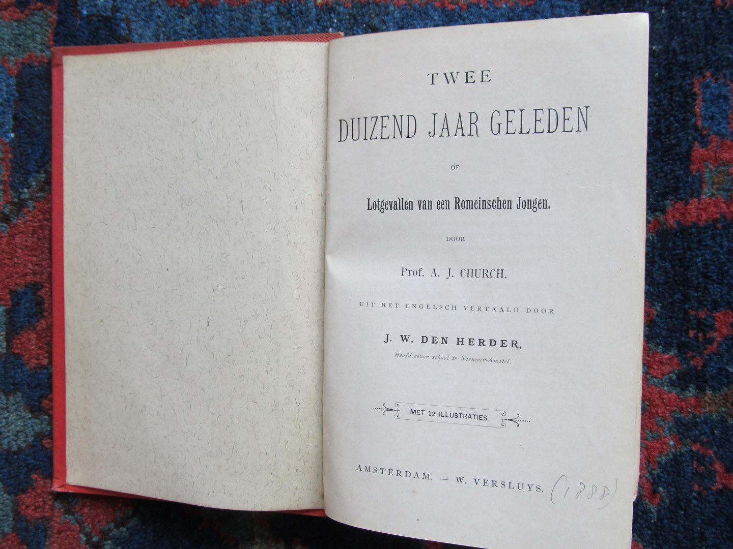 | Titel: | TWEE DUIZEND JAAR GELEDEN og Lotgevallen van een Romeinschen Jongen. Uit het Engelsch vertaald door J.W. den Herder, Hoofd ener school te Nieuwer-Amstel. Met 12 illustraties. |