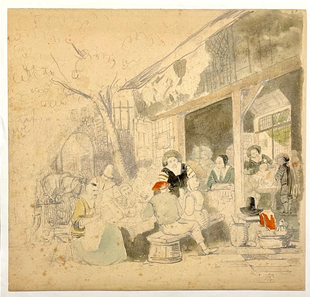 | Bijzonderheden: | Fast and skilful sketch of a 17th-century (Southern Netherlandish?) tavern, with men and women smoking and drinking at a table outside and several men and women in the interior. Made by Belgian artist Leys. In the front one sees a man wearing wo... |