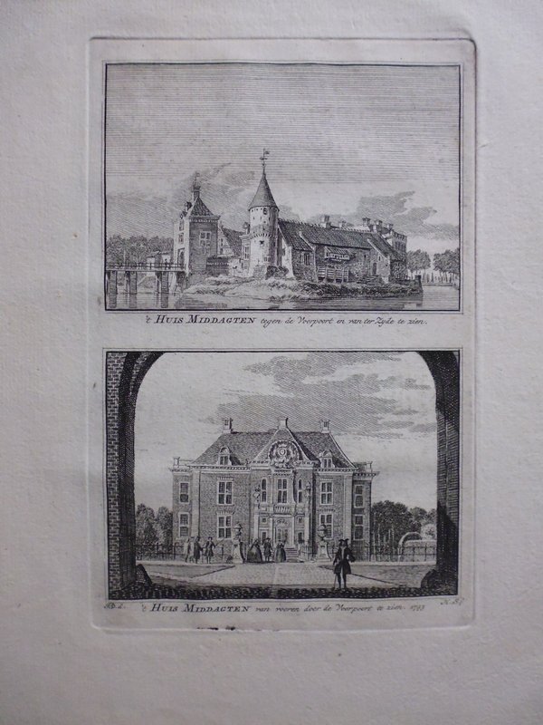 Aanzicht van Kasteel Middagten naar tekeningen van Jan de Beyer (1703-1780) gegraveerd door Hendrik Spilman (1721-1784). Twee gravures van 10.5 x 8 cm op een blad van 19 x 24 cm. Afkomstig uit Het verheerlykt Nederland of Kabinet van hedendaagsche gezigten (1745).