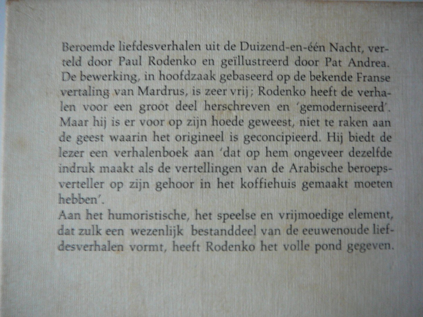 | Titel: | Vrijmoedige liefdesverhalen. Naar verhalen ut Duizend- en een-nacht opnieuw verteld door Paul Rodenko met tekeningen van Pat Andrea. |