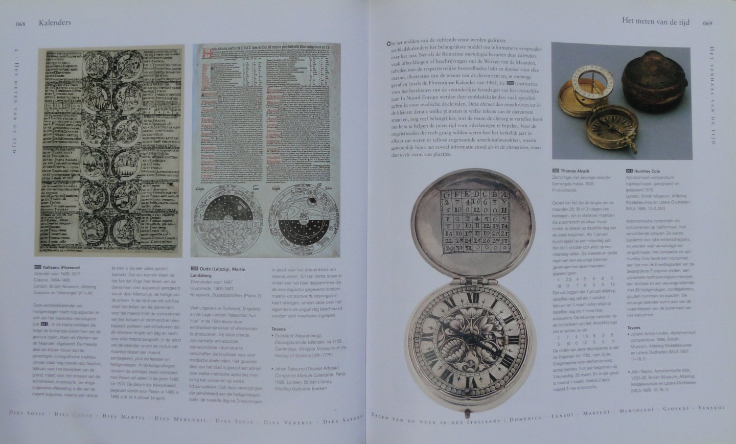 Het jaar 2000 naderde: dus werd er een grote tentoonstelling over tijd gehouden in, uiteraard, Greenwich. Umberto Eco, duidelijk in zijn element, schreef de inleiding. In de vijf volgende hoofdstukken vinden we een groot aantal vrij diepgravende essays (op crèmekleurig papier gedrukt) bij de desbetreffende catalogus(achtige) gedeelten, met daarin prachtige en intrigerende, uitvoering besproken voorwerpen, schilderijen, instrumenten, etc.(op wit papier). Achtereenvolgens: de schepping van de tijd, het meten van de tijd (bij verschillende beschavingen: India, islam, Midden-Amerika, China, Japan, de Inuït, en Europa, natuurlijk), voorstelling van de tijd, de beleving van tijd (in muziek, geneeskunde, verjaardagen, bij de Aborigines etc.), en het einde van de tijd. Alles in 300 met een kleine letter dichtbedrukte pagina's, met zo'n 350 illustraties in kleur. Een heel brede studie, met een schat aan informatie, gedachten en objecten (kaarten, klokken, kalenders, etc.) - dus ook voor de snuffelaar. Verzorgde uitgave.