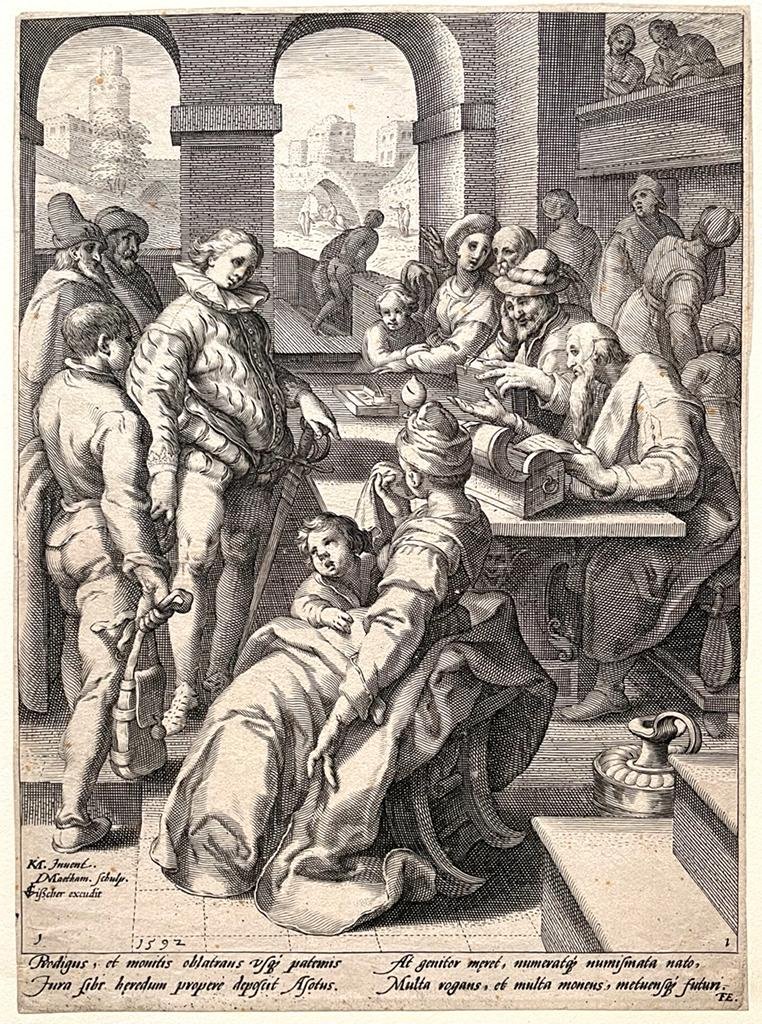 | Titel: | Antique print, engraving | The Parable of the Prodigal Son / De verloren zoon eist zijn erfdeel op, published 1592, 1 p. |