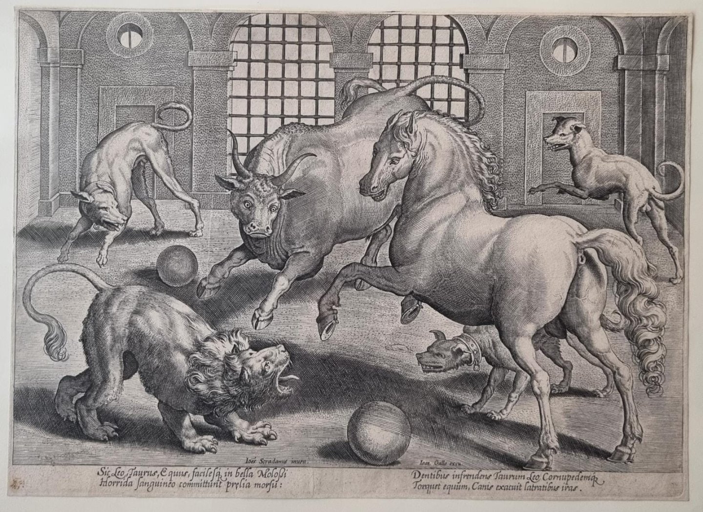 | Bijzonderheden: | Fight among a Lion, Horse, Bull and Dogs, within a room with barred, arched windows behind them, and two spheres on the floor among them.Signed at bottom left of center:'Ioes Stradanus inuen.'and towards the right:'Ioan. Galle excu.'.Below four li... |