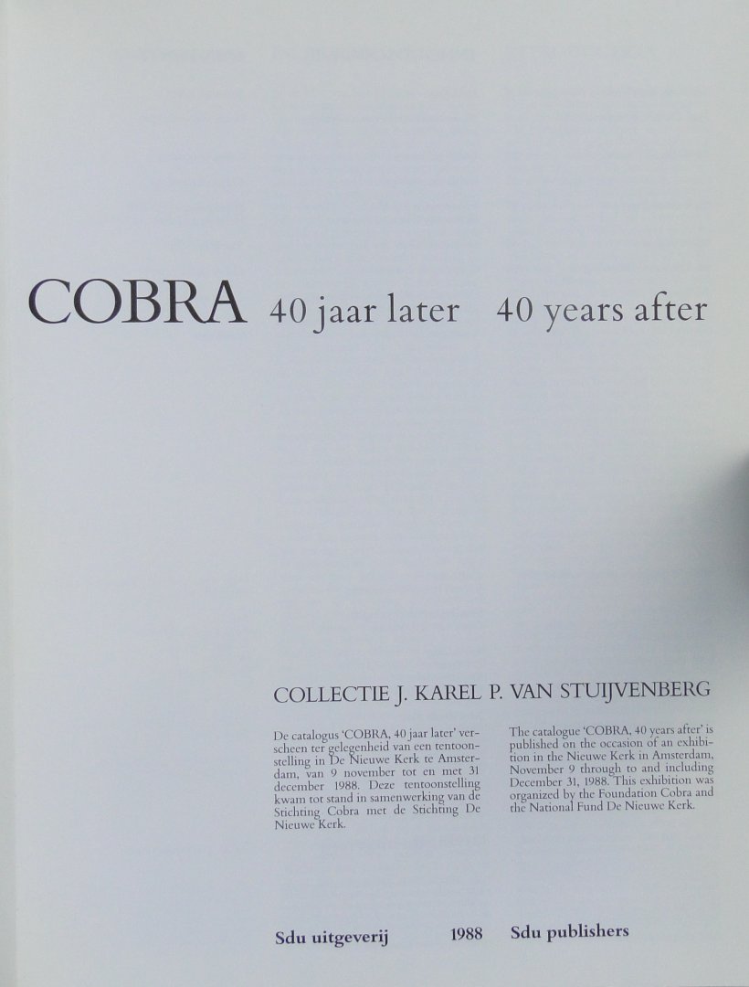 De zakenman Van Stuyvenberg verzamelde een enorme collectie Cobra-kunst, niet alleen van de bekenden als Appel, Constant, Alechinsky en Jorn, maar ook van minder bekende kunstenaars om de verzameling zo compleet en divers mogelijk te maken. De expositie ervan in de Amsterdamse Nieuwe Kerk t.g.v. 40 jaar Cobra baarde opzien, eerder door de kwantiteit dan door de kwaliteit. Dit boek is de grondige, zeer interessante en helder vormgegeven catalogus bij de expositie en bevat zes leesbare teksten van prominente specialisten (zoals Stokvis) over uiteenlopende onderwerpen als de kunsthistorische betekenis van Cobra, haar cultuurhistorisch overzicht en natuurlijk een uitgebreide, alfabetische catalogus van kunstenaars en hun werk met korte biografische gegevens. Alles overvloedig geïllustreerd met kleur- en zwartwit-afbeeldingen