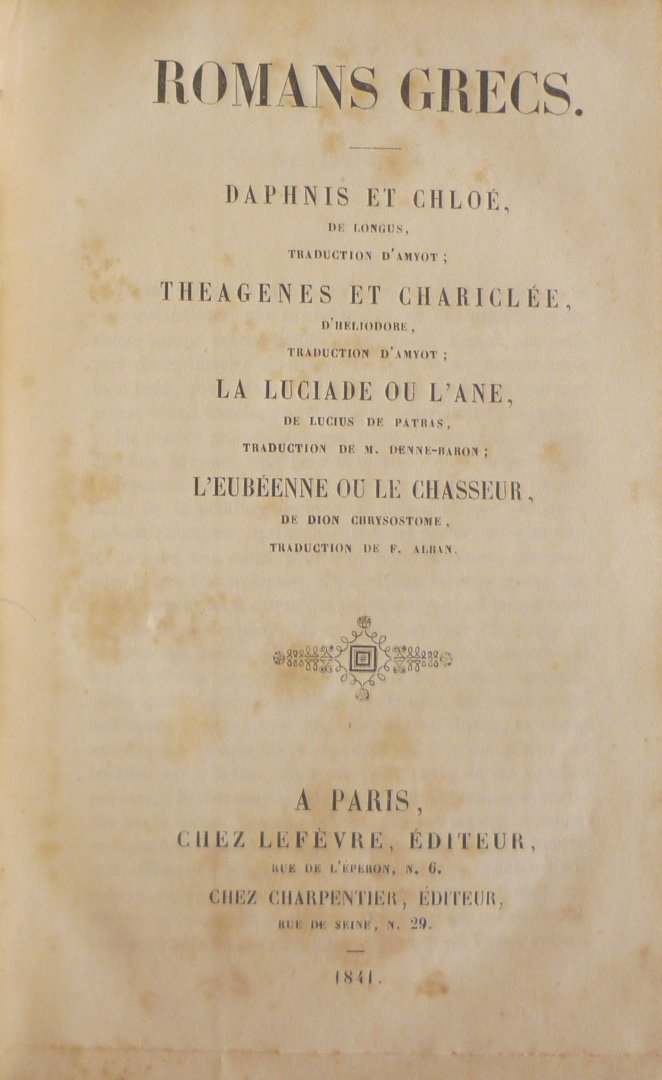 Theagenes et Chariclée, d'Héliodore, traduction d'Amyot. La Luciade ou l'Ane, de Lucius de Patras, traduction de M. Denne-Baron. L'Eubéenne ou le Chasseur, de Dion Chrysostome, traduction de F. Alban. Goede staat, gebruikssporen en beschadiging rug, roestvlekjes op eerste pagina's. |