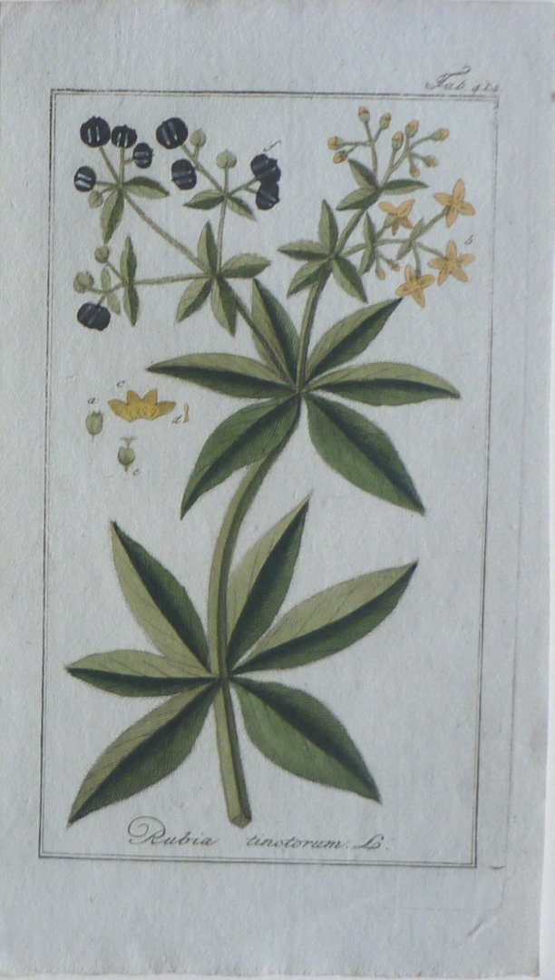 | Titel: | Rubia tinctorum Tab. 414 Originele handgekleurde kopergravure |