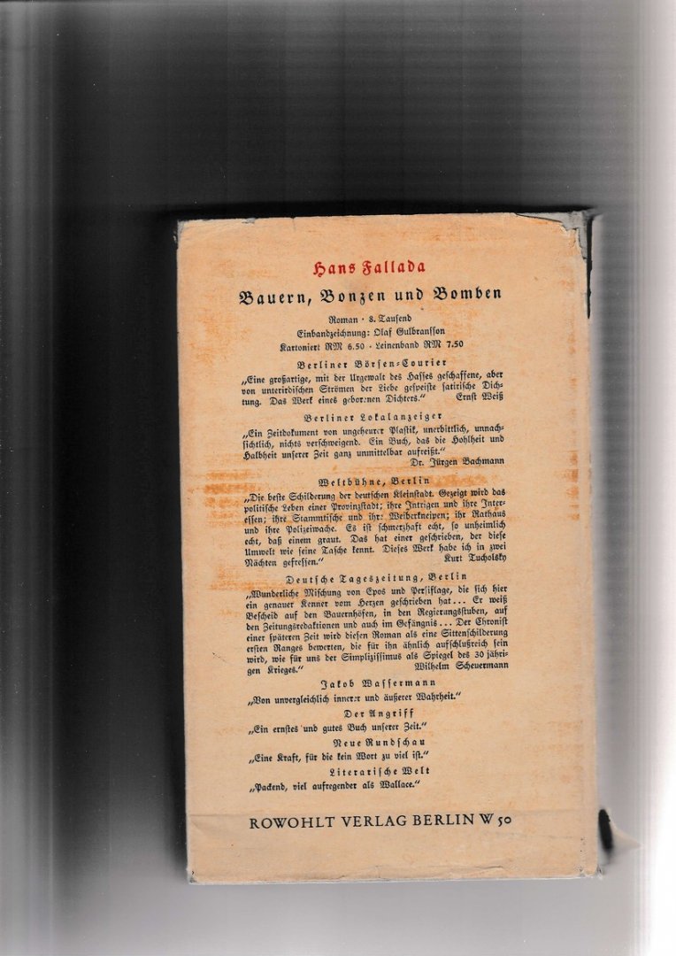 oplage: 49-58 duizend; grijs linnen met belettering in zwart; gedecoreerd (omslagtekening: Walter Müller-Worpswede) papieren omslag met belettering in rood, binnenkant omslag met reclameteksten voor andere boeken; omslag wat gerafeld, kleine stukjes ontbreken, paar kleine scheurtjes; zowel op omslag als op titelpagina in potlood geboorte- en sterfjaar Fallada bijgeschreven; op eerste schutblad naamstickertje vorige eigenaar; op snee wat smoezelig