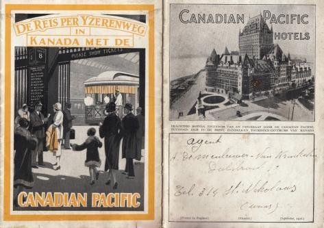 No place, Canadian Pacific Railway, 1926. Large size folder. 75 x 36 cm folding into 24 pages. Printed in yellow and black. Fully illustrated with photos. A bit soiled and slightly worn on the sharpest corners. With an adress in the Flemish city of Sint Niklaas written in the address frame. Attractive and decorative advertisement folder, printed in England, September 1926. This is called the Flemish version, so probably there are English and French versions, too. The text is quaint, from a Flemish or Dutch point of view (for instance, neither 'Kanada' nor 'Yzerenweg' have never been in use for 'Canada or 'spoorwegen' in the Low Countries)