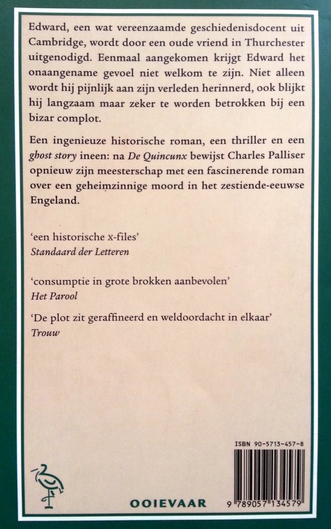 (Ooievaar) ISBN 90-5713-457-8 5e druk 2000 323 pp paperback (stempel op schutblad, verder goed) Staat van het boek: 7.0 In een middeleeuws stadje in Zuid-Engeland komt eind negentiende eeuw een professor uit Cambridge logeren bij een oude studievriend, die een armoedig bestaan als leraar leidt. De professor grijpt de gelegenheid aan om in de bibliotheek van de kathedraal research te doen voor een historisch geschrift. Tijdens zijn verblijf wordt een rijke bankier vermoord. De nooit opgeloste moord vertoont overeenkomsten met een moord die in de zestiende eeuw in de kathedraal werd gepleegd. Het verslag van de hoogleraar wordt pas na de dood van alle betrokkenen uitgegeven door een toenmalige koorknaap, die onbewust een rol speelde in het drama. De royaal uitgegeven roman zal alleen die lezers boeien die over veel tijd, historische belangstelling en enige intelligentie beschikken. Omslag toont een bedrijvige markt op een kerkplein. Kleine druk. Toptienboek (abonnement 1, 2 en ij). Zie voor andere bindwijze a.i.'s deze week. (Biblion recensie, Mr. M. Wijnstroom.) Prijs €3,50 |