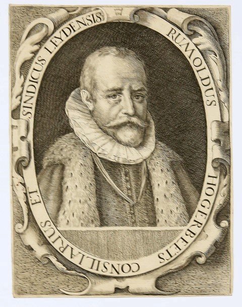 | Bijzonderheden: | Bust portrait of Rombout Hogerbeets with fur lined toga. In oval with strap-work, lettered: 'RUMOLDUS HOGERBEETS CONSILIARIUS ET SINDICUS LEYDENSIS'. |
