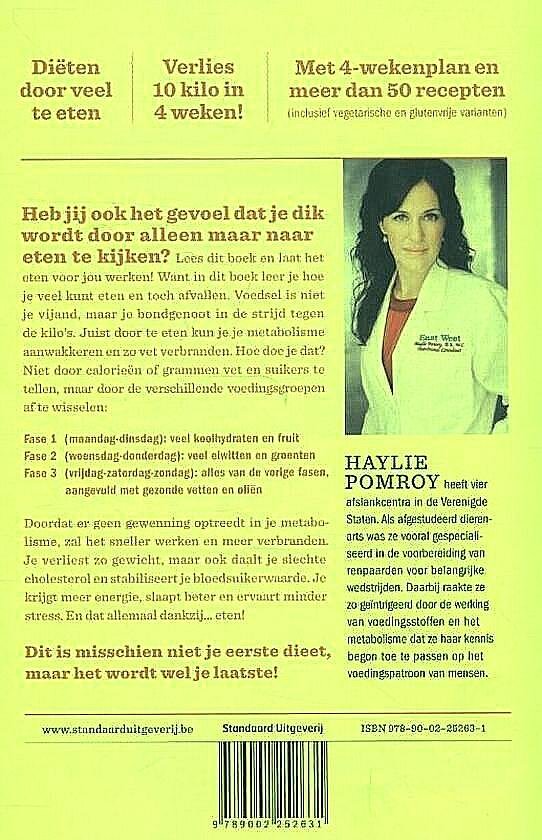 - Want in dit boek leer je hoe je veel kunt eten en toch afvallen. Voedsel is niet je vijand, maar je bondgenoot in de strijd tegen de kilo's. Juist door te eten kun je je metabolisme aanwakkeren en zo vet verbranden. Hoe doe je dat? Niet door calorien of grammen vet en suikers te tellen, maar door de verschillende voedingsgroepen af te wisselen:Fase 1 (maandag-dinsdag): veel koolhydraten en fruitFase 2 (woensdag-donderdag): veel eiwitten ene groentenFase 3 (vrijdag-zaterdag-zondag): alles van de vorige fasen aangevuld met gezonde vetten en olinDoordat er geen gewenning optreedt in je metabolisme, zal het sneller werken en meer verbranden. je verliest zo gewicht, maar ook daalt je slechte cholesterol en stabiliseert je bloedsuikerwaarde. je krijgt meer energie, slaapt beter en ervaart minder stress. En dat allemaal dankzij... eten!Diëten door veel te eten - Verlies 10 kilo in 4 weken - Met 4-wekenplan en meer dan 50 recepten (inclusief vegetarische en glutenvrije varianten) Haylie Pomroy heeft vier afslankcentra in de Verenigde Staten. Als afgestudeerde dierenarts was ze vooral gespecialiseerd in de voorbereiding van renpaarden voor belangrijke wedstrijden. Daarbij raakte ze zo gentrigeerd door de werking van voedingsstoffen en het metabolisme dat ze haar kennis begon toe te passen op het voedingspatroon van mensen.