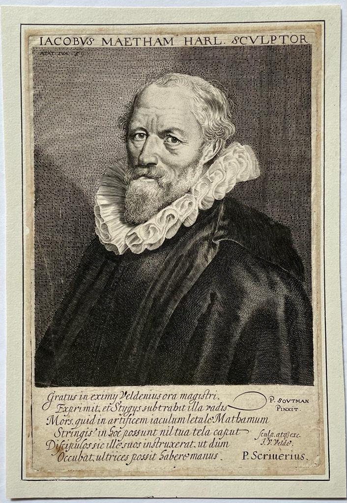 | Bijzonderheden: | Bust portrait of the painter Jacob Matham (1571-1631). Inscribed above:´IACOBVS MAETHAM HARL SCVLPTOR´, signed below on the right:´P. SOVTMAN / PINXIT´; ´ sculp. atq. exc. / J.V.Velde.´ ; below the portrait inscription in Latin by Scriverius... |