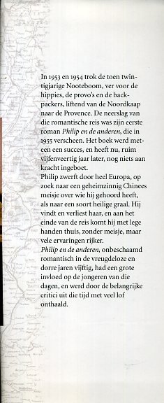 In zijn debuutroman Philip en de anderen vertelt Nooteboom over zijn omzwervingen door Europa, van de Noordkaap af tot diep in de Provence toe. Het is een poëtische roman vol zeggingskracht over een jongen die langs de asfaltlinten en de kasseien van Europa lift. Hij is op zoek naar ruimte, naar het paradijs, naar een Chinees meisje. Zijn speurtocht brengt hem met vele anderen in contact, maar wanneer hij terugkeert bij de oude oom die hem tot de reis geïnspireerd heeft, en die hem vraagt: Heb je iets voor me meegebracht? moet hij antwoorden: Nee oom, ik heb niets voor u meegebracht. Het reizen zelf was de grote ontdekking, en dat is voor Nooteboom zo gebleven.