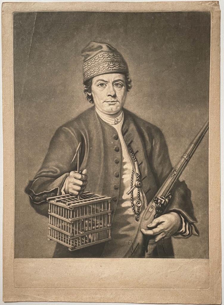 | Bijzonderheden: | A man shown three-quarters length standing directed slightly to right, looking towards the viewer, holding a shotgun against his hip and a bird cage in his right hand, wearing a plain coat open, with a chain of small bells and whistles hanging fro... |