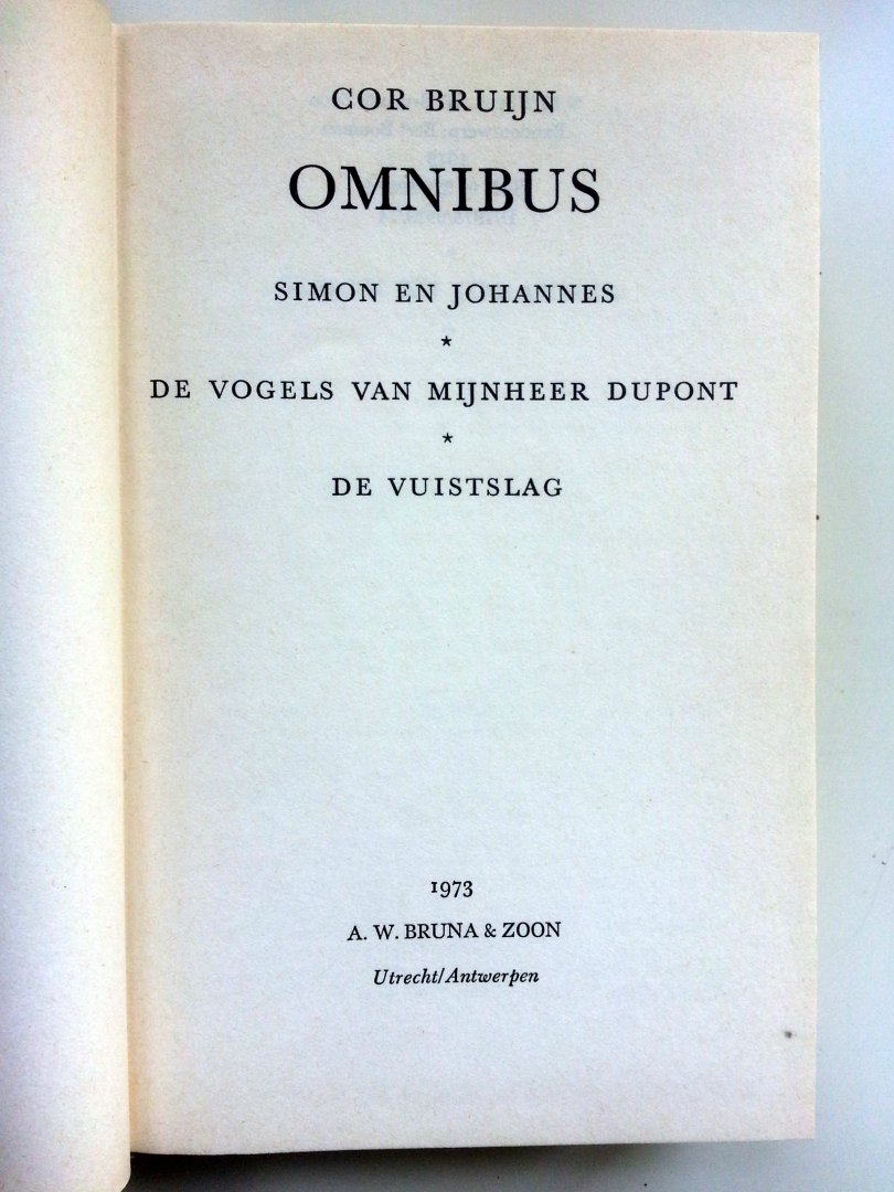 Cor Bruijn Omnibus - Simon en Johannes - De vogels van mijnheer Dupont - De vuistslag (A.W. Bruna & Zoon - Utrecht / Antwerpen) ISBN 90 229 5097 2 uitgave uit 1973 587 pp hardcover gebonden (in goede staat!, rug verkleurd) Staat van het boek: 7.5 Prijs €4,50 |