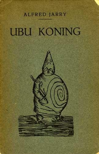Zeldzame uitgave met de eerste Nederlandse vertaling van het bekende Franse toneelstuk Ubu Roi dat voor het eerst gepubliceerd werd in 1896 en gezien wordt als het begin van het Dadaisme en Surrealisme. In de vertaling is de oorspronkelijke tekening van Ubu volgens Jarry zowel op de kaft als tegenover de titelpagina afgedrukt, de laatste met een citaat van Vondel. Een illustratie van een man met een spitse neus en hippe hoed is geplaatst boven de lijst van personagien en de 'avertissement' door de vertalers.