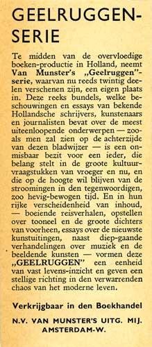 | Meer info: | Folder vanb de uitgeverij Munster in Amsterdam voor haar "geelruggen" serie met neschouwingen van bekende Hollandsche schrijvers, kunstenaars en journalisten over de meest uiteenlopende onderwerpen. |