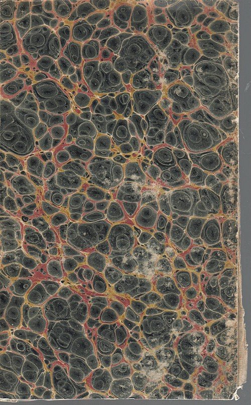 Afmeting: 22cm. Randen niet glad gesneden en daardoor iets groezelig en rafelig. Het fraai gemarmerde kaft vertoont wat slijtage.. |