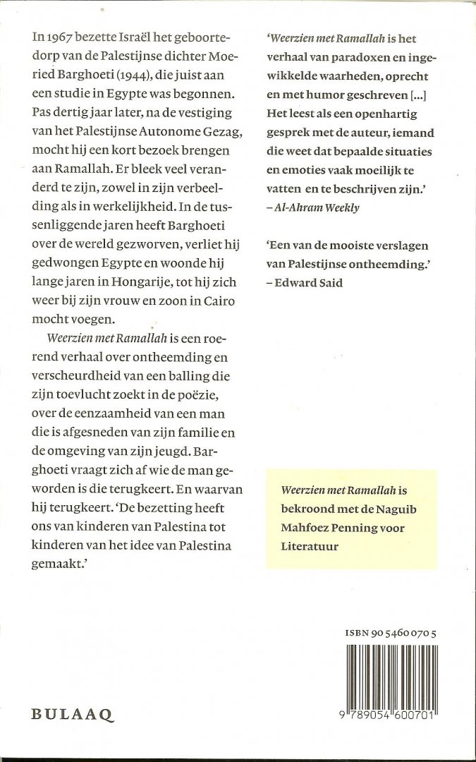 | Schrijver: | Barghoeti, Moeried .. Vertaald uit het Arabisch door Djuke Poppinga en Richard van Leeuwen .. Omslagontwerp Marjo Starink Foto omslag Penny Tweedie |